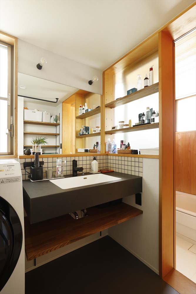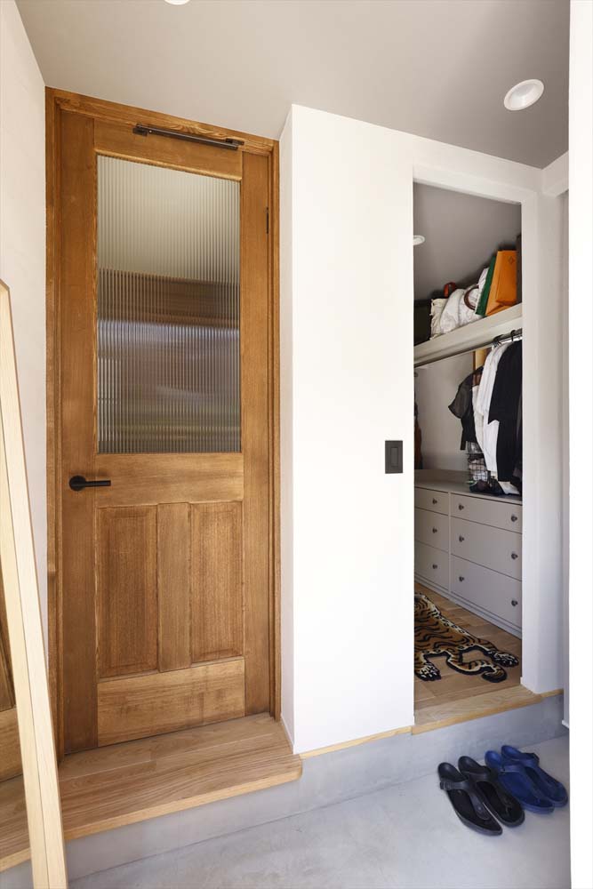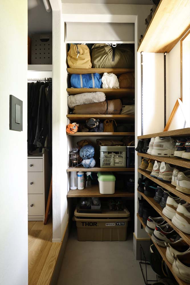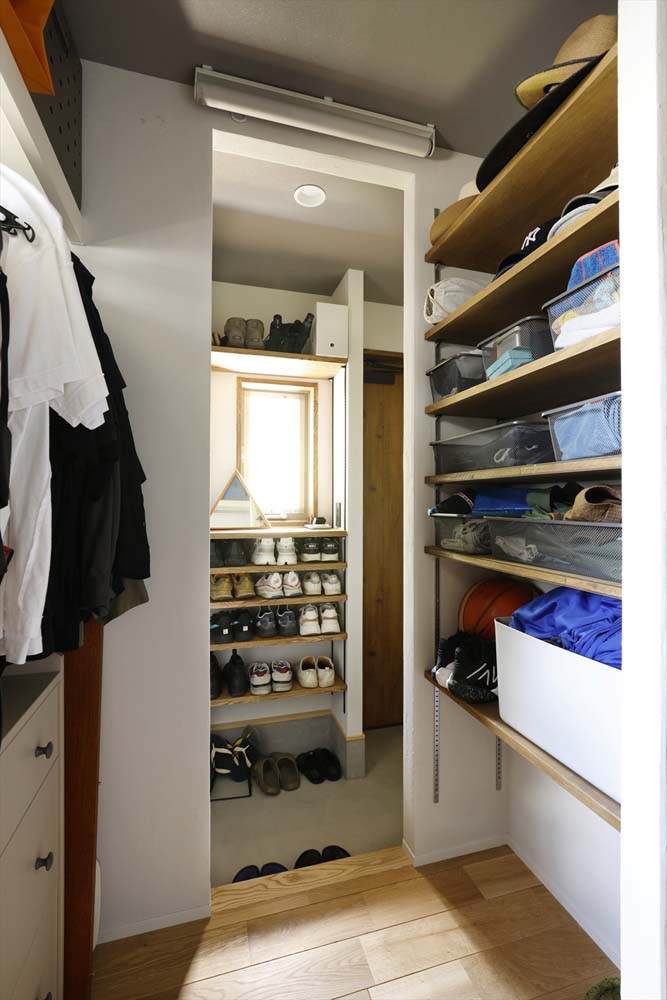 プランニングのポイントとなったのは、1階を南北に分断していた玄関の移動。以前より北側へずらすことで南側のLDKの広さを確保した。玄関近くにはIさん&Aさんの希望に合わせて土間収納とウォークインクローゼットを設置。ウォークインクローゼットはLDKへ通り抜けができるウォークスルー型とし、身支度や帰宅後の着替えなどをスムーズにできるようにした。
