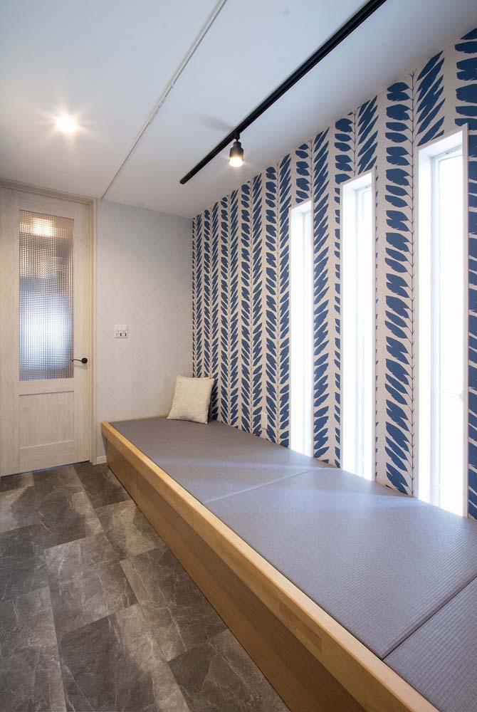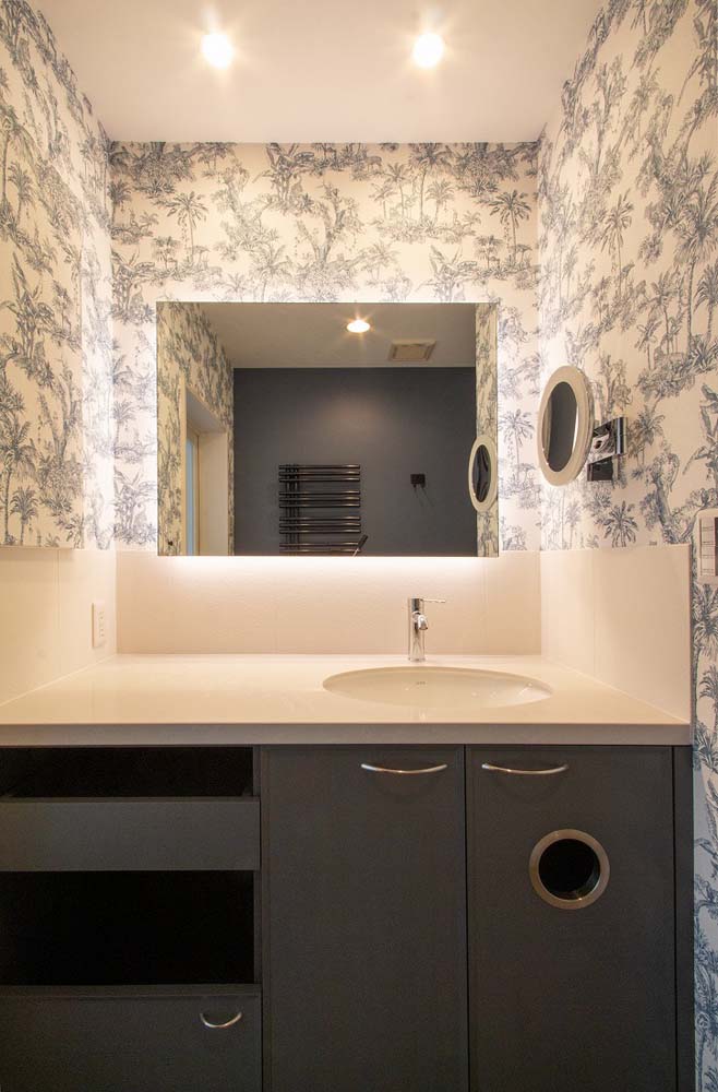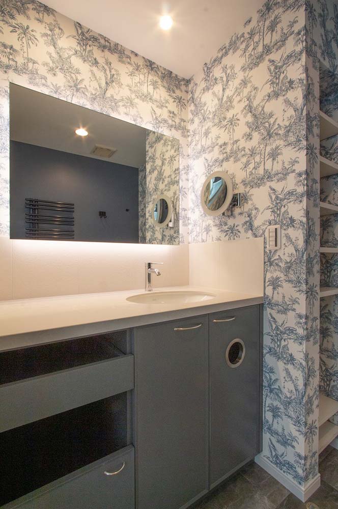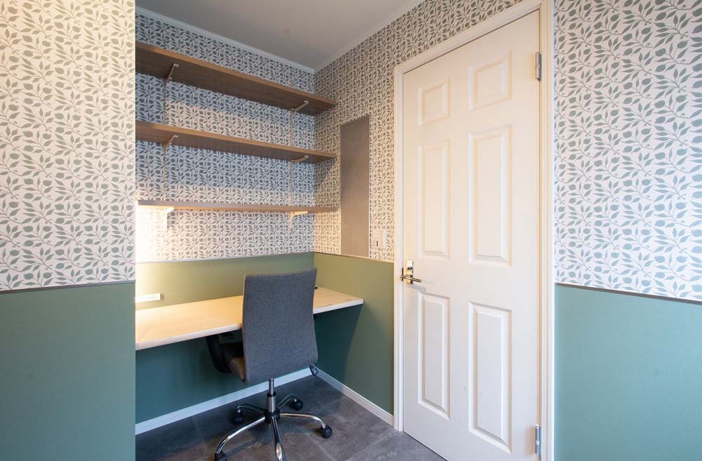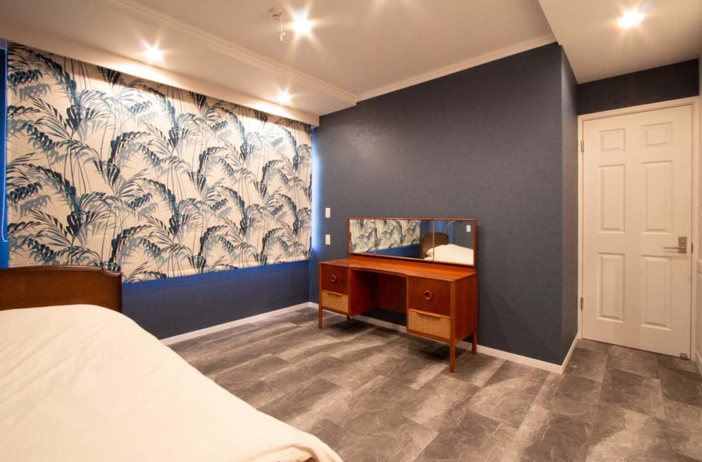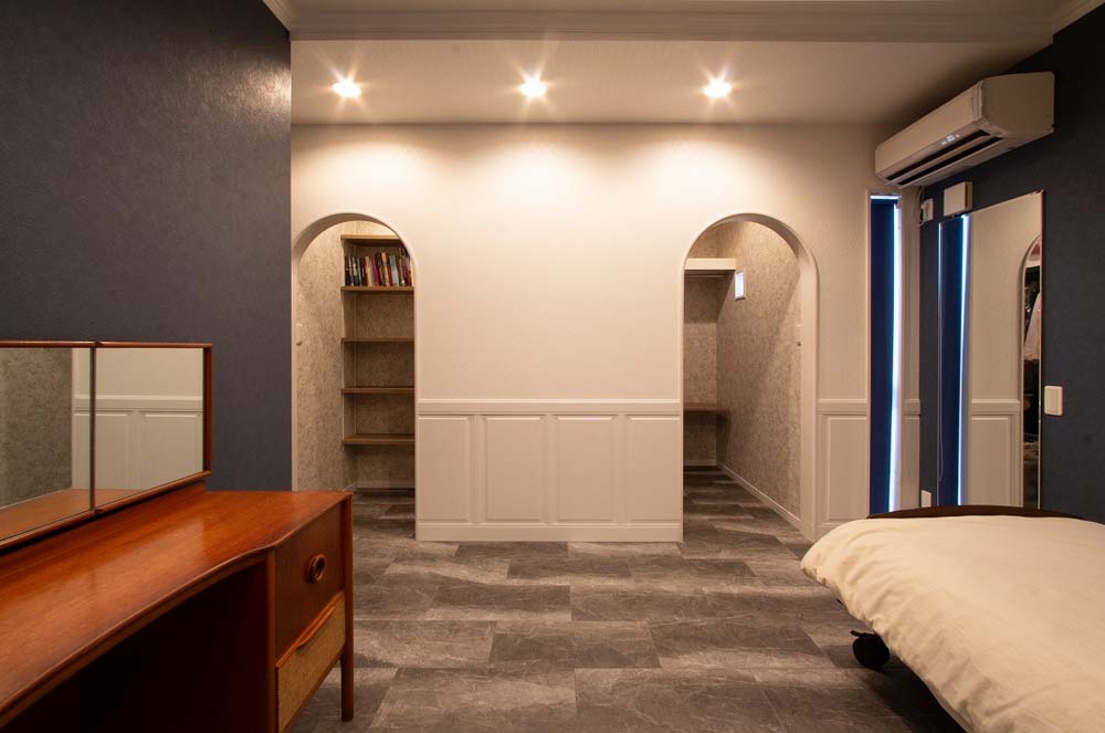 もともとアール壁があった寝室には立体的な腰壁をあしらい、クラシックな雰囲気に。深いブルーの壁紙と華やかなロールスクリーンを合わせ、落ち着いたホテルライクな空間に仕立てました。また書斎やトイレには英国の芸術家ウィリアム・モリスの壁紙を使用。住まいのあちこちに装飾性の高い美しいものを散りばめ、統一感のあるエレガントな空間を演出しています。