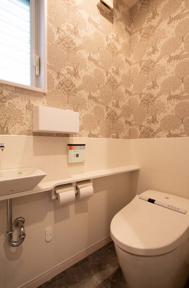 「英国風のテイストが好き」という施主夫妻。華やかなブルーの壁紙にクラシックなソファを合わせてエレガントにまとめています。
