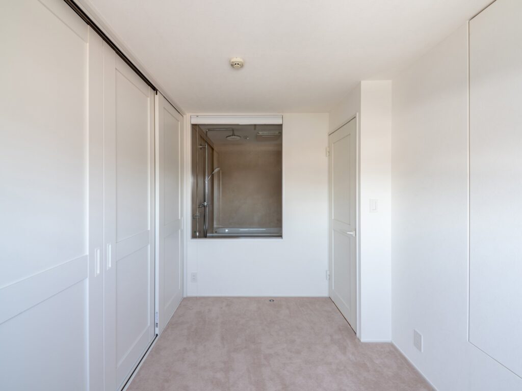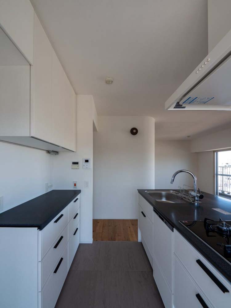 コンセプトは、「視線の抜けを良くして家全体に光が届くようにすること」。そこで壁を取り払って1LDKに変え、キッチンをはじめ水まわりの位置を大きく動かしました。「限られた面積の中でも、おおらかで開放的な空間となるよう、光の反射や視線の抜けにも配慮しています。自然光がやわらかく広がり、どこにいても心地よさを感じられるように工夫しました」と設計スタッフは話します。