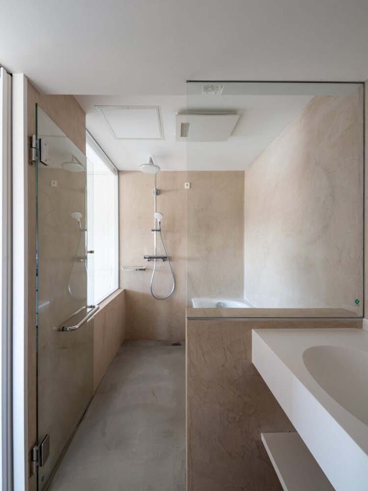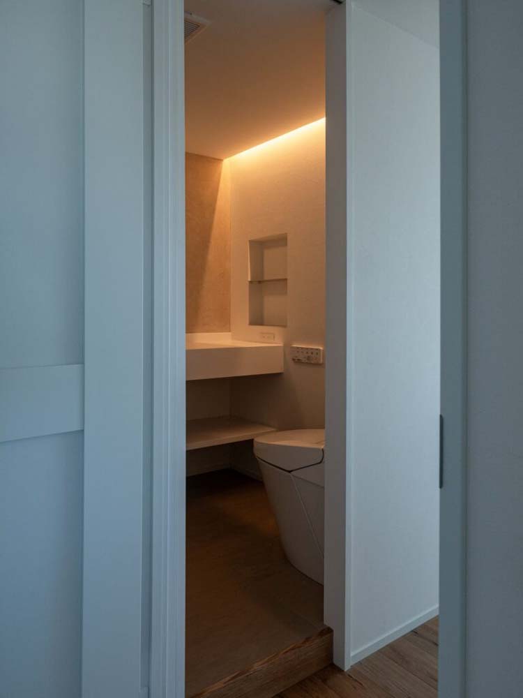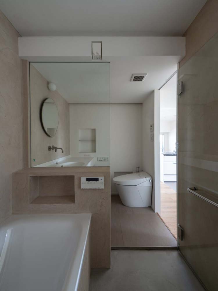 浴室、洗面、トイレは一か所にまとめて空間を有効利用。外窓のない浴室ですが、昼間は驚くほど明るい空間です。その理由は、隣接する個室に室内窓を設け、屋外からの光を呼び込んでいるから。浴室のみガラス戸で仕切ることで、光を全体に行き渡らせています。