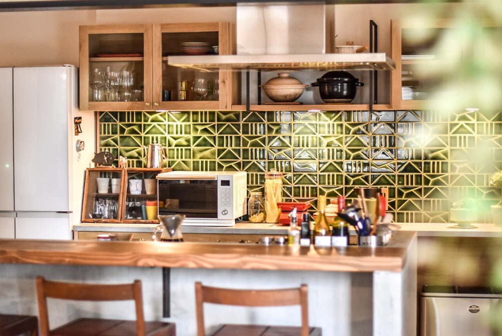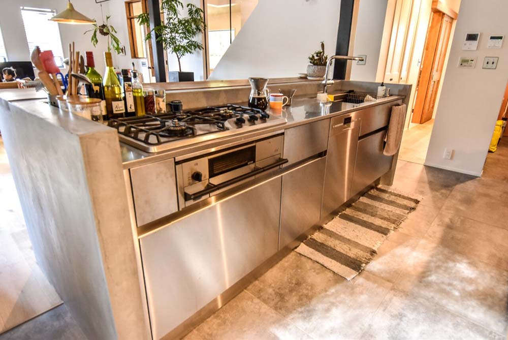 キッチンは既存の位置を活かしながらオープンに。モールテックスの腰壁、無垢板のカウンター、ステンレスのキッチン本体、幾何学模様のタイル、と素材感が際立つカッコいい空間をつくっています。