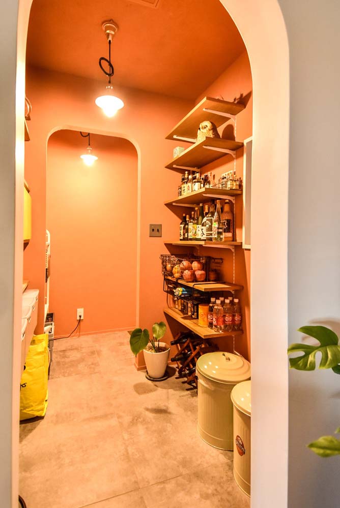 背面には造作のカウンター収納と吊戸棚、すぐ隣にパントリーを配置。収納力を高めることで、作業がしやすく、リビングダイニングにもゆとりが生まれました。