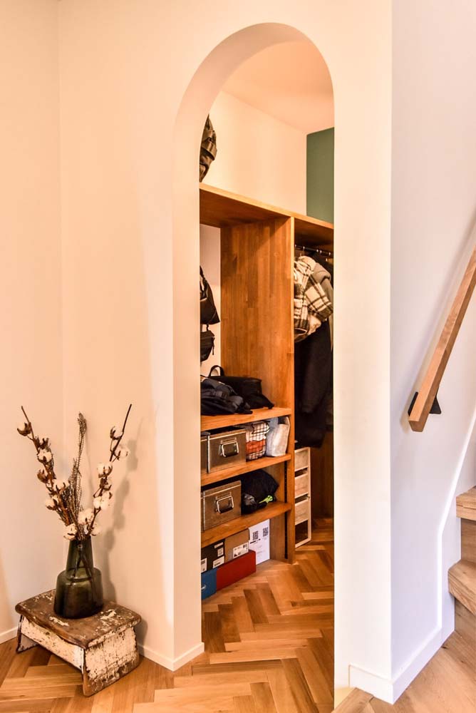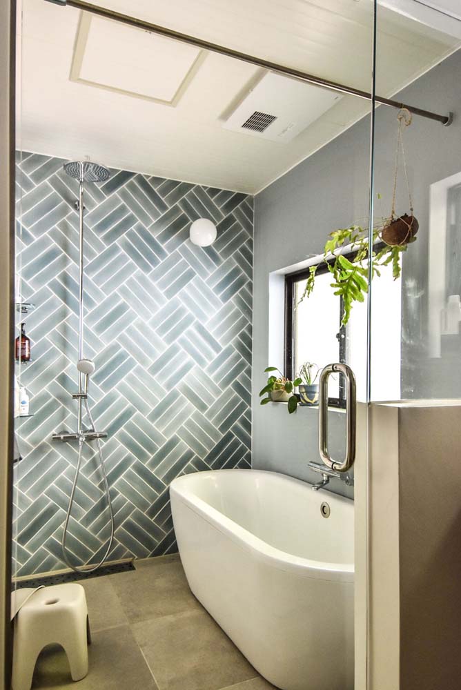 玄関前の廊下はなくし、ウォークインクローゼットと洗面室に変更してスペースを有効活用。バスルームやトイレはアンティーク風のタイルを張ってホテルライクに仕上げました。