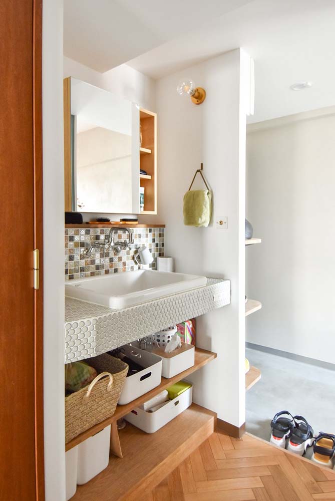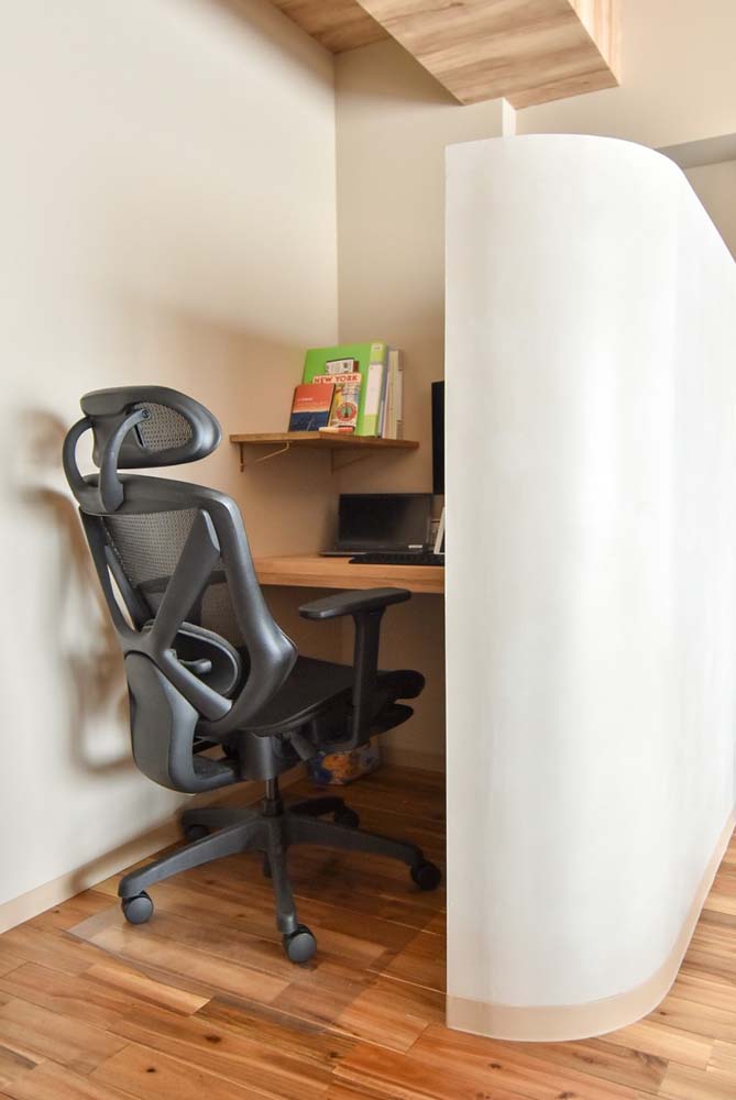 リビングの一角には、アールの壁で仕切ったワークスペースを配置。壁の高さを抑えることで、開放感とこもり感を兼ね備えたスペースになりました。バルコニー側は、メインのフローリングの床を切り替え、畳スペースとタイル敷きのインナーテラスに。自然光がたっぷり入る場所なので、読書や日向ぼっこと楽しみが広がります。