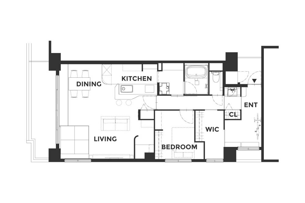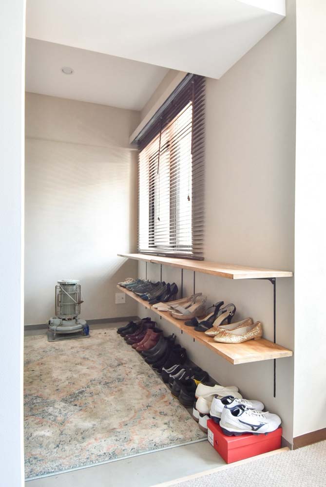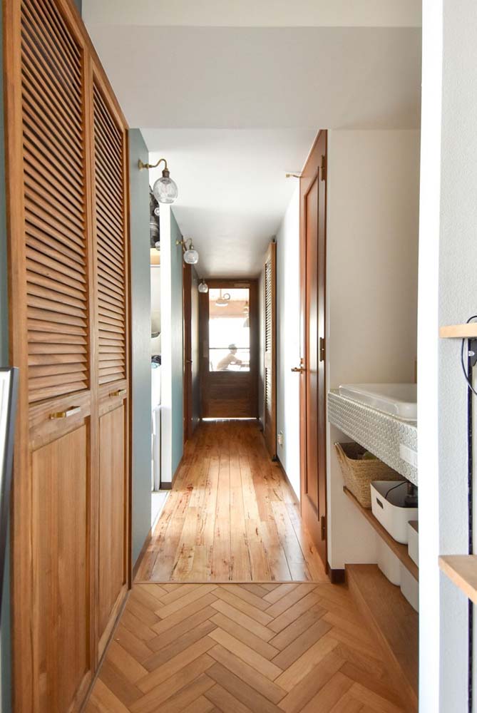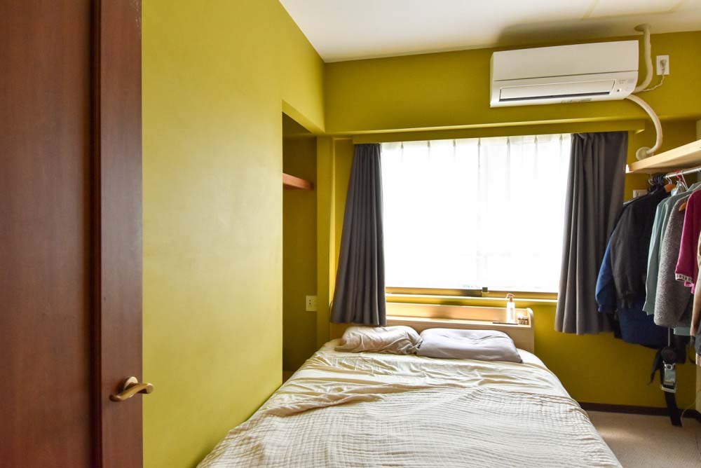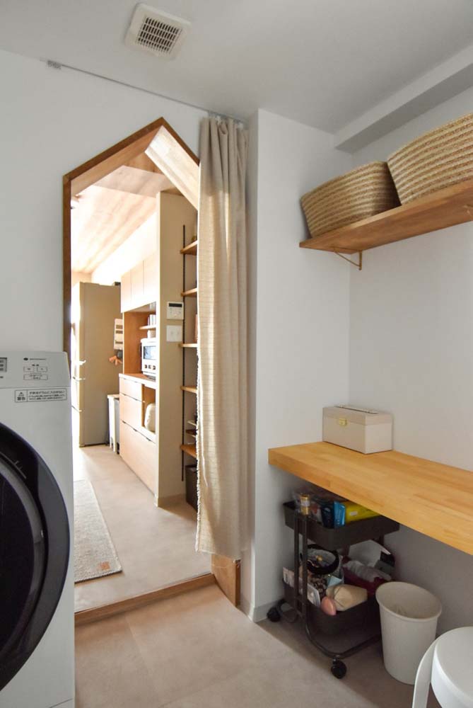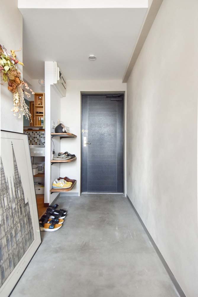 間取りは3LDKから1LDKに変更し、リビング、ダイニング、キッチンをひと続きに。ベッドルーム横には、将来間仕切って個室を増やせるウォークスルークローゼットをつくりました。エントランスはアウトドアグッズの収納やDIYの作業スペースに使えるよう、土間部分を拡張。もともとリフォーム済みだったため、水まわりの一部を再利用し、リノベーション費用を抑えながら、理想の間取りを実現しています。