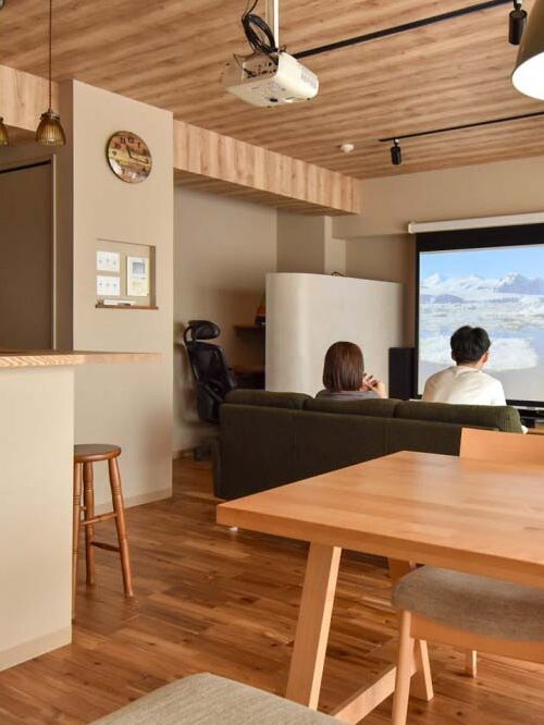 壁を取り払い、ひと続きのLDKに。プロジェクタースクリーンはソファだけでなく、キッチンからも見えるように配置。窓側には畳スペース、壁側にはアール壁で仕切ったワークスぺースも。