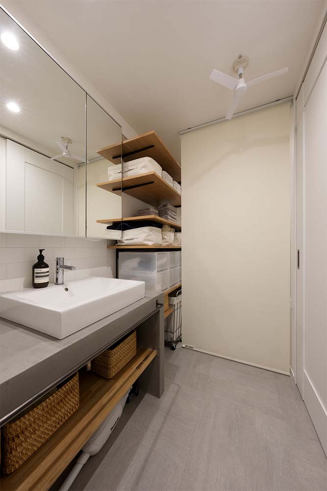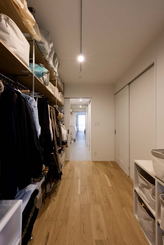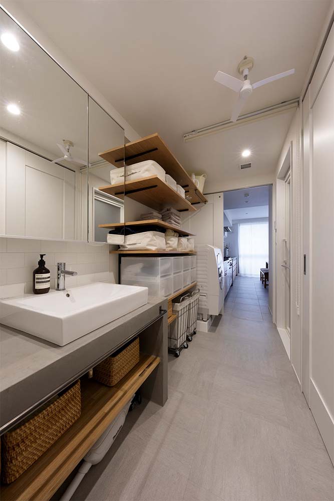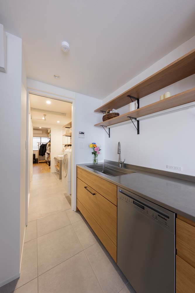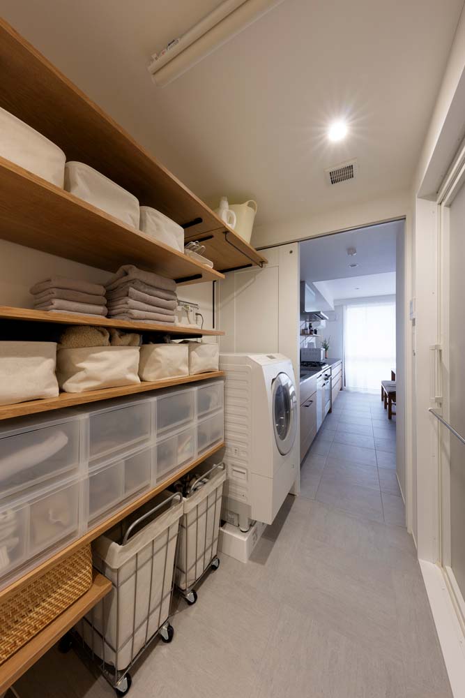 オープンなキッチンから収納たっぷりの洗面室、現在はファミリークローゼットになっている洋室を一列に配置。引き戸やロールスクリーンを開けておけば、ぐるりと回遊できるレイアウトです。