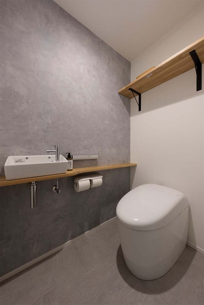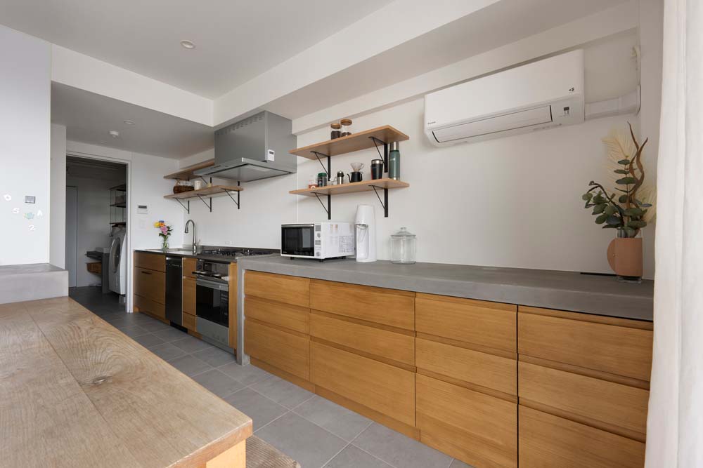 カウンターの素材は以前から気に入っていたモールテックスを選択。ダイニングテーブルの横につくった作業カウンターは、配膳や片付けに便利なのはもちろん、キッチン用品やゴミ箱の収納と妻がダイニングで仕事するとき用のコンセントを設けています。