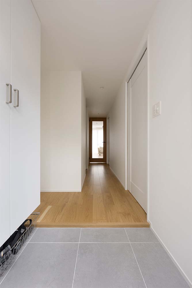 動線の見直しに加え、リビングドアには自然光を通すガラスを採用。奥まで自然光が届くようになり、洗面室や玄関の明るさがグッと増しています。