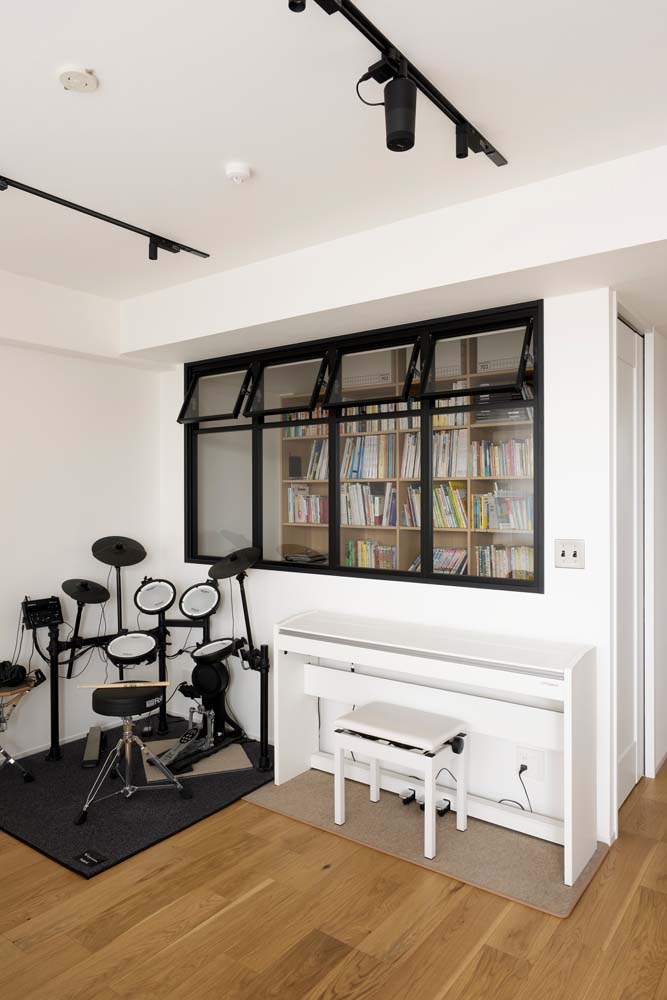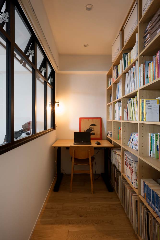 家族揃って本好きなOさんがイメージしたのは、みんなが楽しめる「ブックカフェ」。リビングの一角を大きな室内窓のある壁で仕切り、フルリモートで仕事をする夫のためのワークスペース+壁いっぱいの本棚をつくりました。