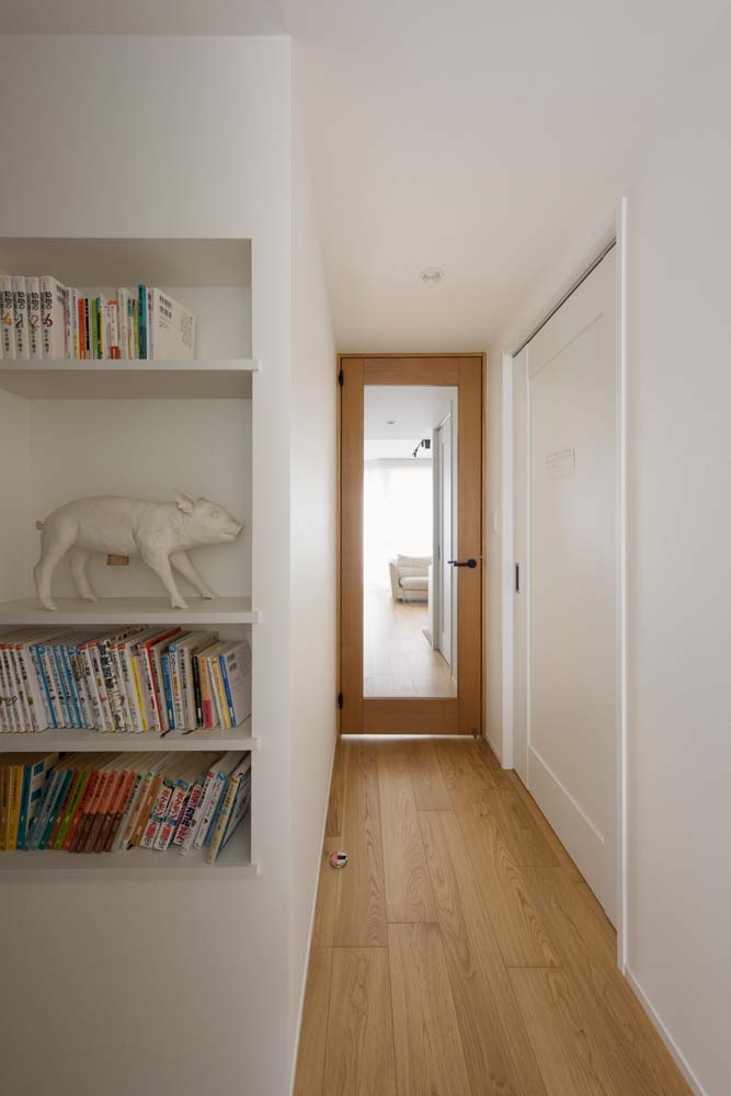 さらに設計するなかで生まれた廊下の隙間にも小さな本棚をプラス。大小2つの本棚は、親子が本を通してふれあえる豊かなスペースになっています。