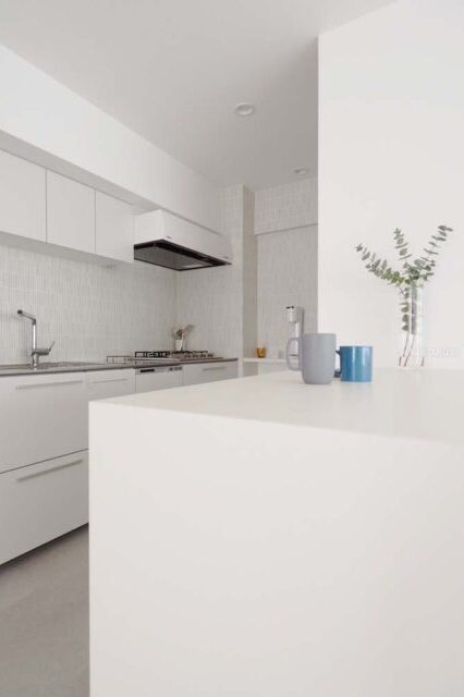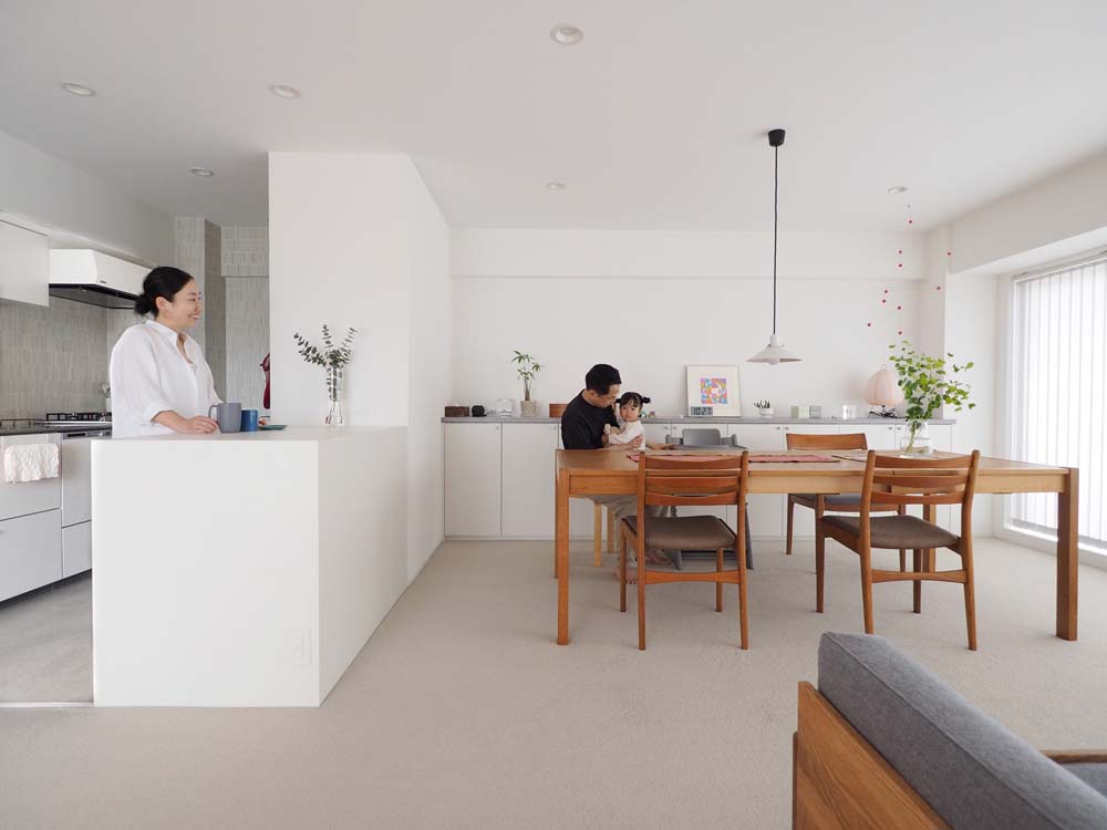 白い壁。白いカウンター。白い家具。窓からの光を受けて明るく軽やかな空間を、グレーのソファや木目の間仕切りが引き締める。すっきり透明感のある、Wさんの住まいです。