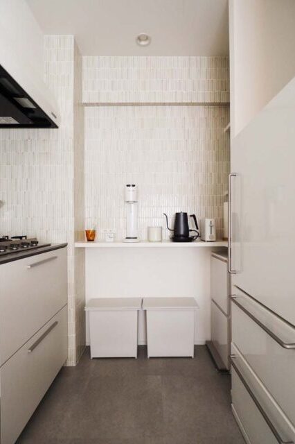 2部屋をつなげて広くなったLDKには、腰高のカウンター収納を造作。オリジナル設計のキッチンカウンターは、リビング側から見るとシンプルな箱ですが、中身は大容量の引き出し収納に。さらに各部屋の収納とウォークインクローゼットを造りつけ、生活空間に余白を残しています。