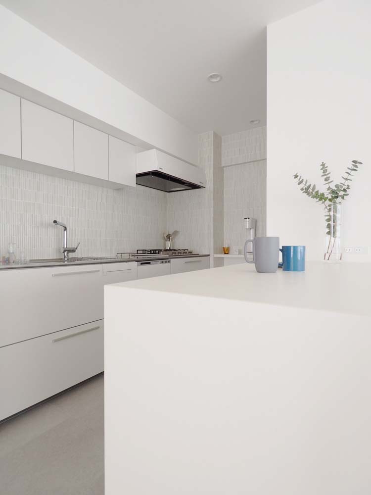 白い壁。白いカウンター。白い家具。窓からの光を受けて明るく軽やかな空間を、グレーのソファや木目の間仕切りが引き締める。すっきり透明感のある、Wさんの住まいです。