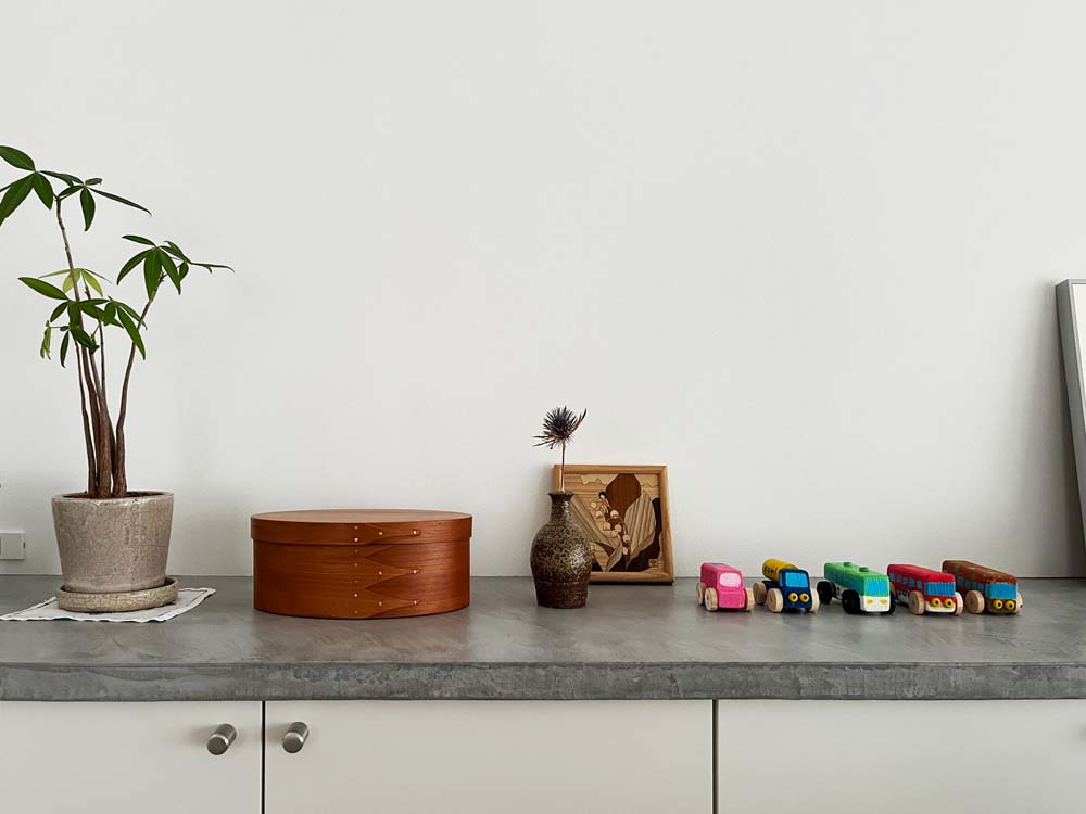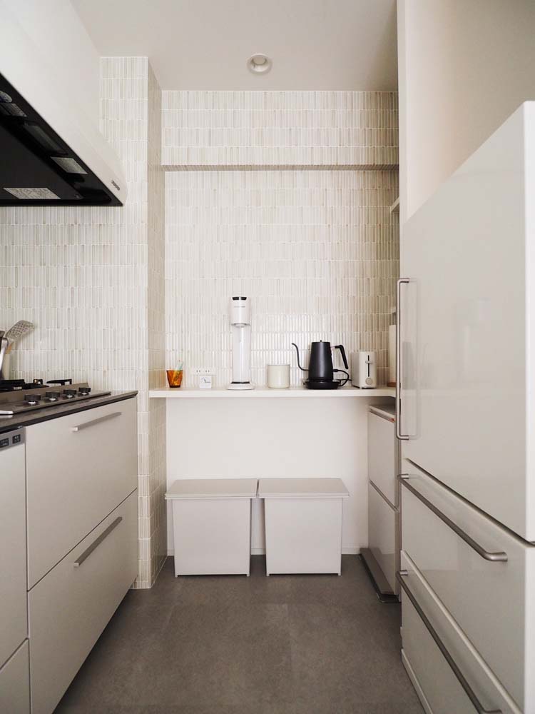 2部屋をつなげて広くなったLDKには、腰高のカウンター収納を造作。オリジナル設計のキッチンカウンターは、リビング側から見るとシンプルな箱ですが、中身は大容量の引き出し収納に。さらに各部屋の収納とウォークインクローゼットを造りつけ、生活空間に余白を残しています。