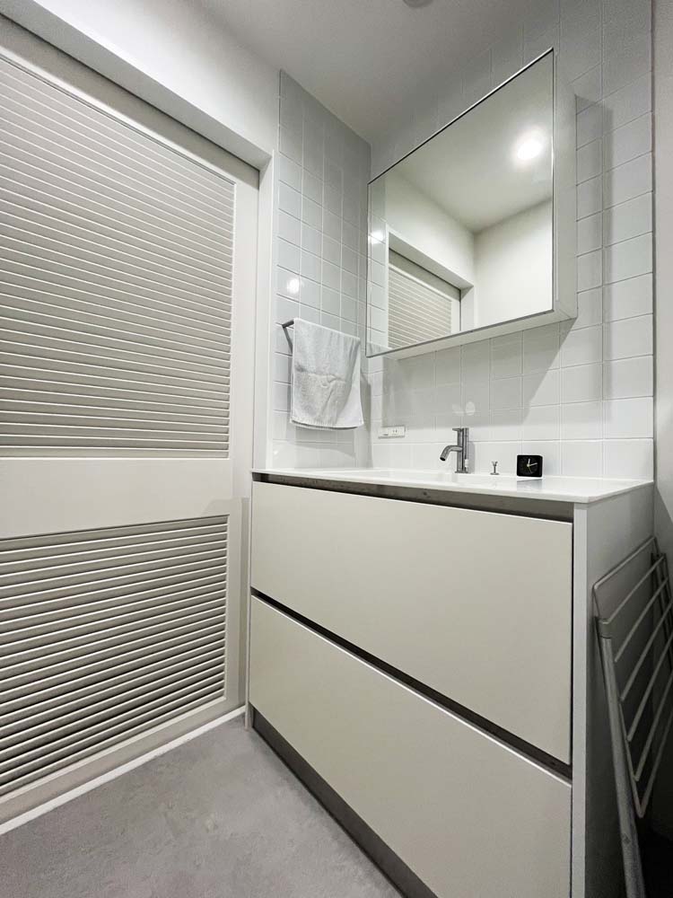 収納を造作することで、生活する場所がすっきりとしていますね。置き家具が最小限になり空間の凹凸が減ることが、余白につながっています。白、グレー、木目が配された空間は、クールでありながら素材感に安らぎます。
