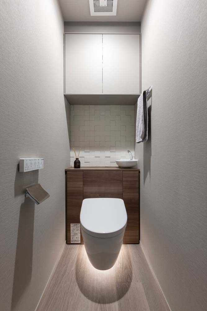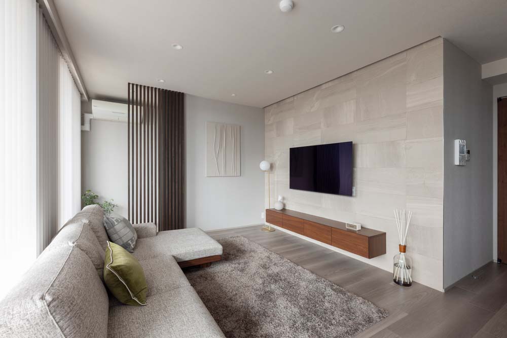ひと続きにしたLDKは、淡い色味のグレーやグレージュで統一。テレビは壁付け、その下のリビングボードはフロートタイプを選び、家具もできるだけ少なくすることで、ホテルのような余白のある空間をつくりました。テレビ側の壁には間接照明を設置し、ダウンライトとともに明るすぎない快適な光をコーディネート。リビング奥の間仕切りルーバーは、冷暖房の効果を妨げず、尚且つインテリアのアクセントになっています。