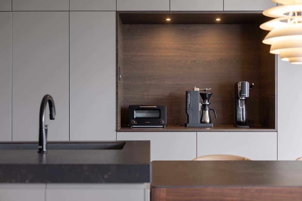 グレイッシュカラーでホテルライクな住まいに。造作キッチンを空間に馴染ませたリノベーション