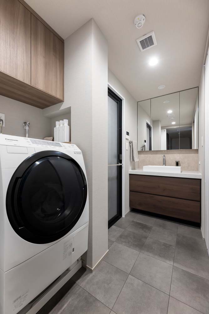 また、洗面室や玄関、書斎の収納も、キッチンと同じ素材を使って造作。玄関のルーバーもリビングと揃え、デザイン性の高い、調和のとれたスタイルを完成させています。
