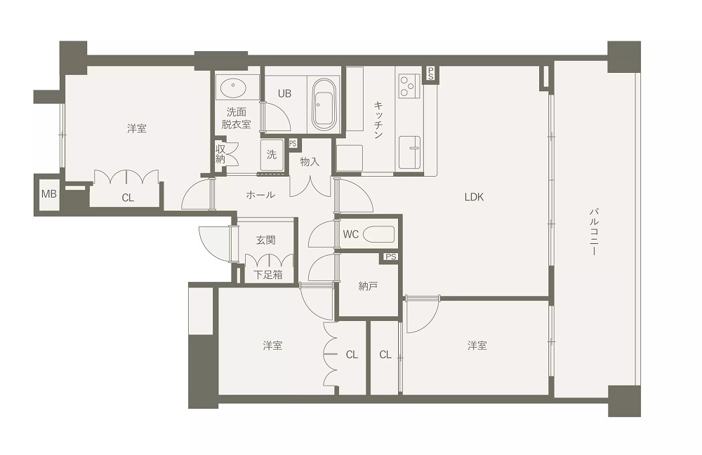 明るさを感じるグレイッシュカラーでまとめた空間は、上品なホテルのようですね。グレーの濃淡、家具やルーバーの木目を取り入れることで、単調ではなく、メリハリのあるコーディネートになっています。存在感がありつつ空間に馴染んでいるキッチンも魅力です。