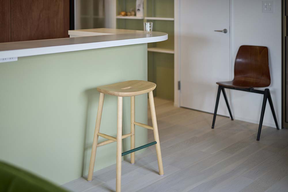 インテリアは、ミッドセンチュリーのテイストに。イメージに合う家具を散りばめ、壁のアクセントとして淡いグリーンを選択。中央部分を躯体現しにした折り上げ天井も、丸みをもたせることでミッドセンチュリー感を演出しています。