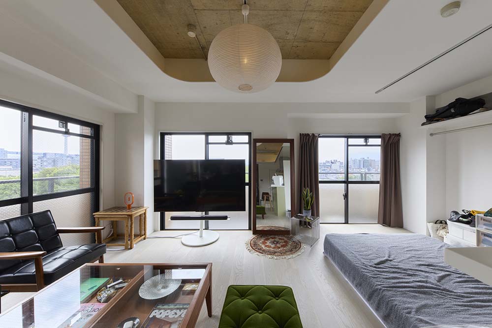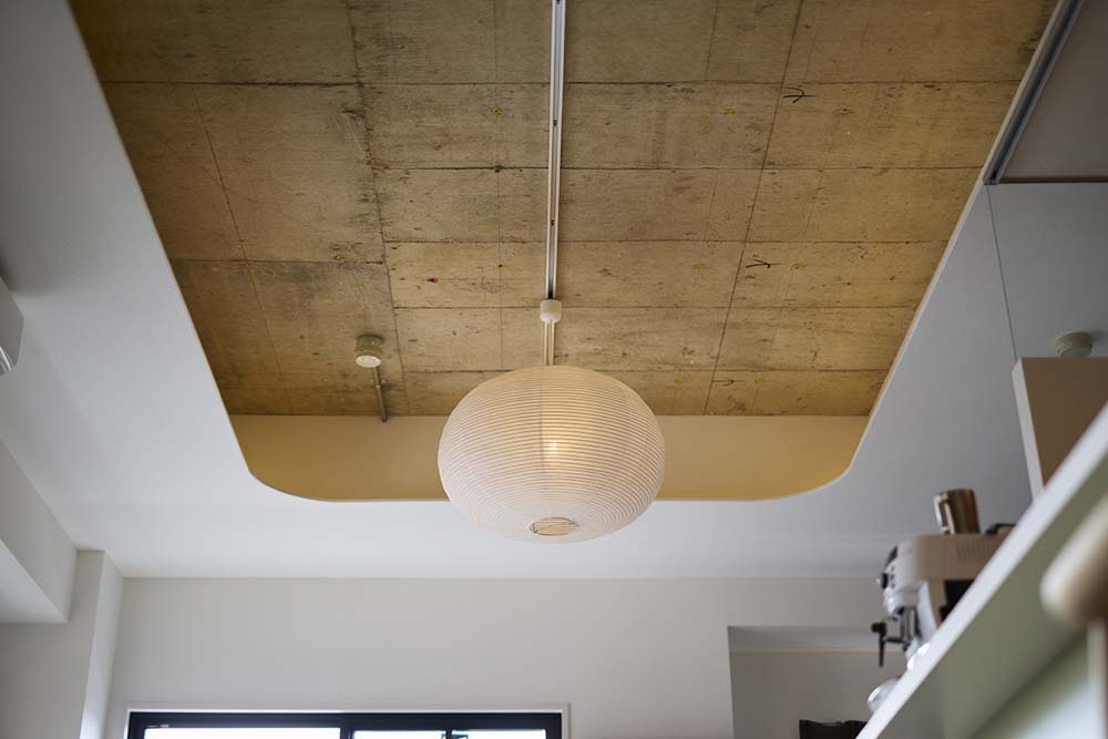 ミッドセンチュリーのデザインを程よく取り入れた、居心地のよい住まいです。シェアハウスでの生活を反映したカウンターキッチンもポイントになっていますね。躯体現しの折り上げ天井がユニークで、空間を広く見せています。