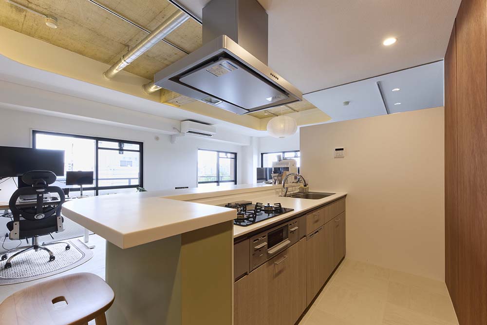 リノベーションのコンセプトは「人が集まれる場所」。その象徴として、ワンルームの中心にカウンターキッチンを採用しました。「シェアハウスには必ずと言っていいほど共用部にカウンターキッチンがあるんです。自然と人が集まって会話が生まれる雰囲気が好きでした」。