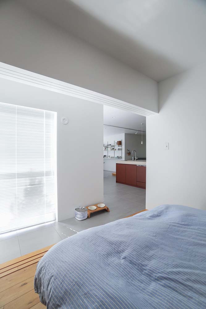 その奥には寝室&ワークスペースを配置。3連の造作引き戸は袖壁に完全に引き込むことができるため、日中はフルオープンにしていることが多いといいます。