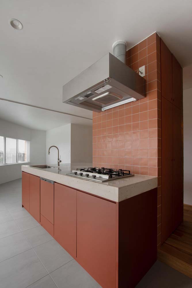テラコッタ色のキッチンが印象的な住まいです。こちらのマンションを購入に至った経緯もデザインに組み込んでいるのが良いですね。細部にまでこだわりが詰まったインテリアが、洗練されていて魅力的です。