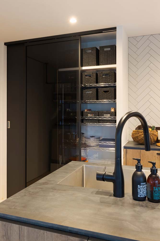 「仕事を終えてキッチンに立つ時間が、気分転換になっています」とNさん。3階建ての2階をLDKとして、小さいながらも機能的なキッチンを配置。ペニンシェラ型のワークトップは、友人4人で作業をしてもゆとりがあります。