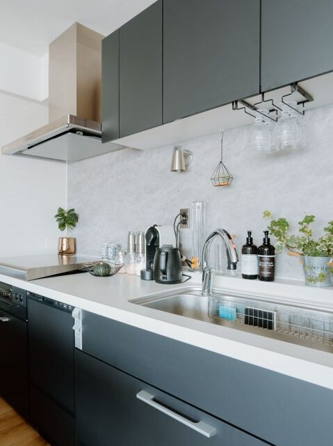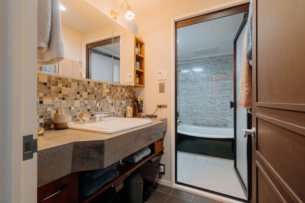 もともとDIYが得意で、家のメンテナンスやインテリアづくりを楽しんでいたという施主。リノベーションでは、プロの提案を柔軟に受け入れつつ、すべての仕上げ材を自分で選びました。洗面室は、壁タイルの購入から配置のデザインまで施主が担当し、猫の足を洗うことを考えながら洗面ボウルのサイズなどを決定。既存の食洗機やコンロには、新しいキッチンと同じ面材を張って統一感をもたせています。