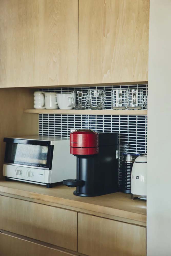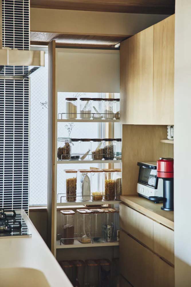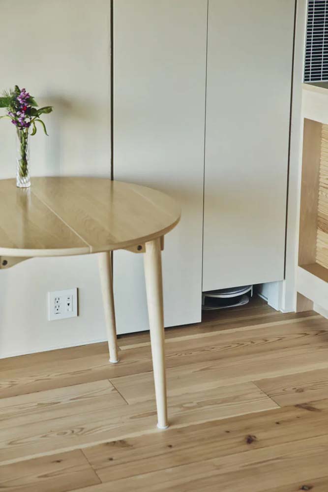 日本の建築が大好きという夫を中心に、YouTubeやInstagramを参考にしながら、和と洋のミックスインテリアを構築。内装には自然素材をふんだんに使い、床は杉無垢フローリング、壁は珪藻土、天井は小幅板風の杉の羽目板で仕上げました。キッチンは天然木のパネルで囲み、家具のような佇まいに。直線的なラインと明るい樹種の組み合わせが、ジャパンディスタイルのような心地よさを生み出しています。