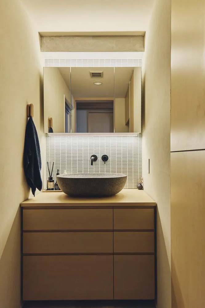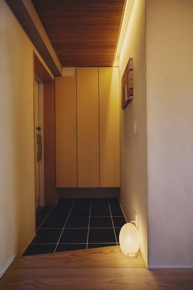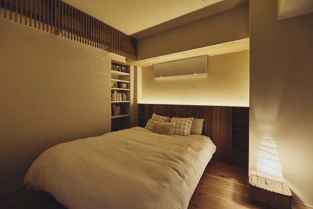 玄関や廊下だけでなく、小さな日本庭園をつくった寝室も、柔らかな光でくつろぎ感を演出。「昼白色の蛍光灯と違って、この光だと本当にリラックスできて、夜は早く眠くなるんです。暗くなってから家に帰ると、マンションの中で、わが家だけ窓から黄色い光が漏れているのも気に入っています」。