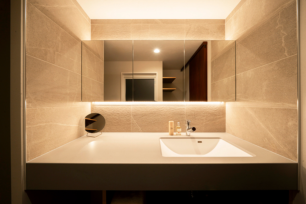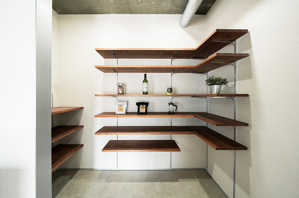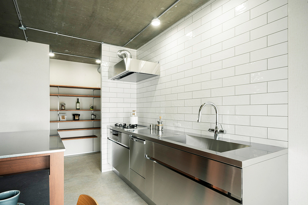 その中で洗練された印象を演出しているのは、ゴールドとシルバー。ホールを中心として巾木などに真鍮(ゴールド)を使い、LDKにはステンレス(シルバー)のキッチンを選択。照明の鋼製配管やレンジフード、パントリーの入口にもシルバー色を取り入れました。