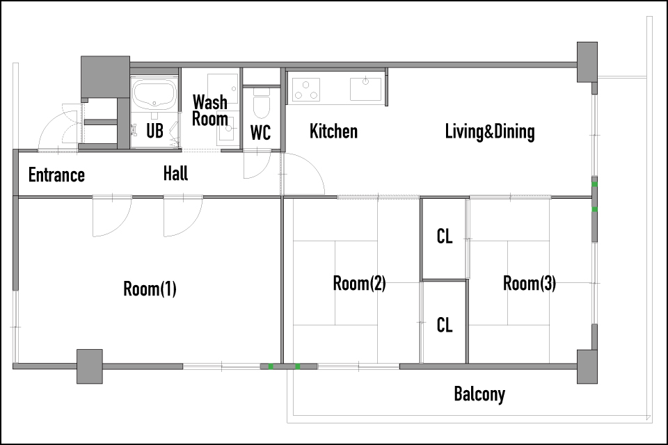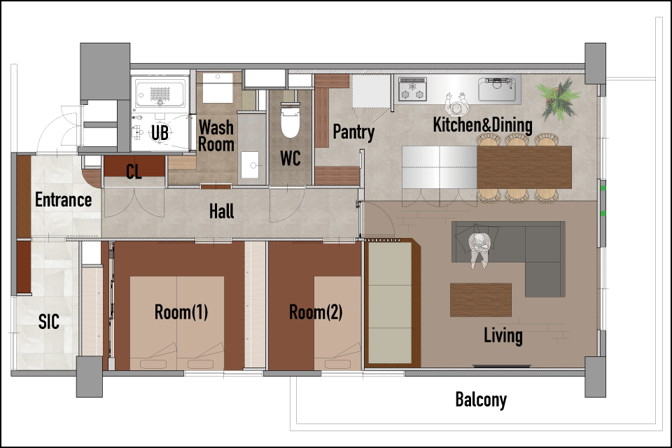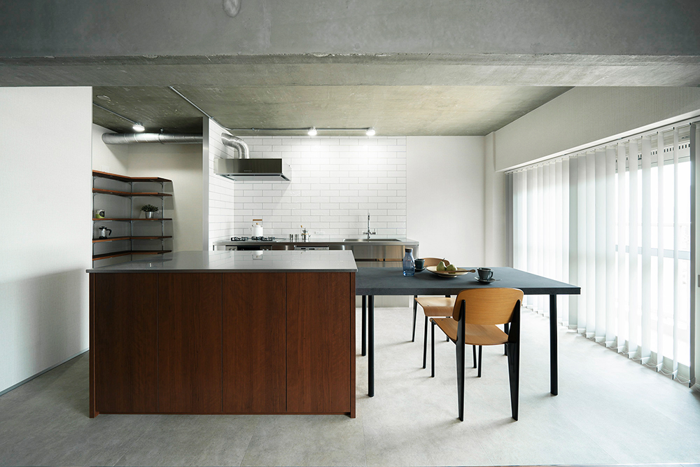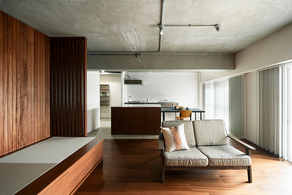 間取りは3LDKから2LDKに変更。LDKをグッと広くとり、開放感のあるくつろぎの場所をつくりました。リビングには広々とした畳敷きの小上がりを設置。キッチンはサイズアップし、アイランドの作業台とダイニングテーブルを並べ、作業しやすい回遊動線も組み込んでいます。