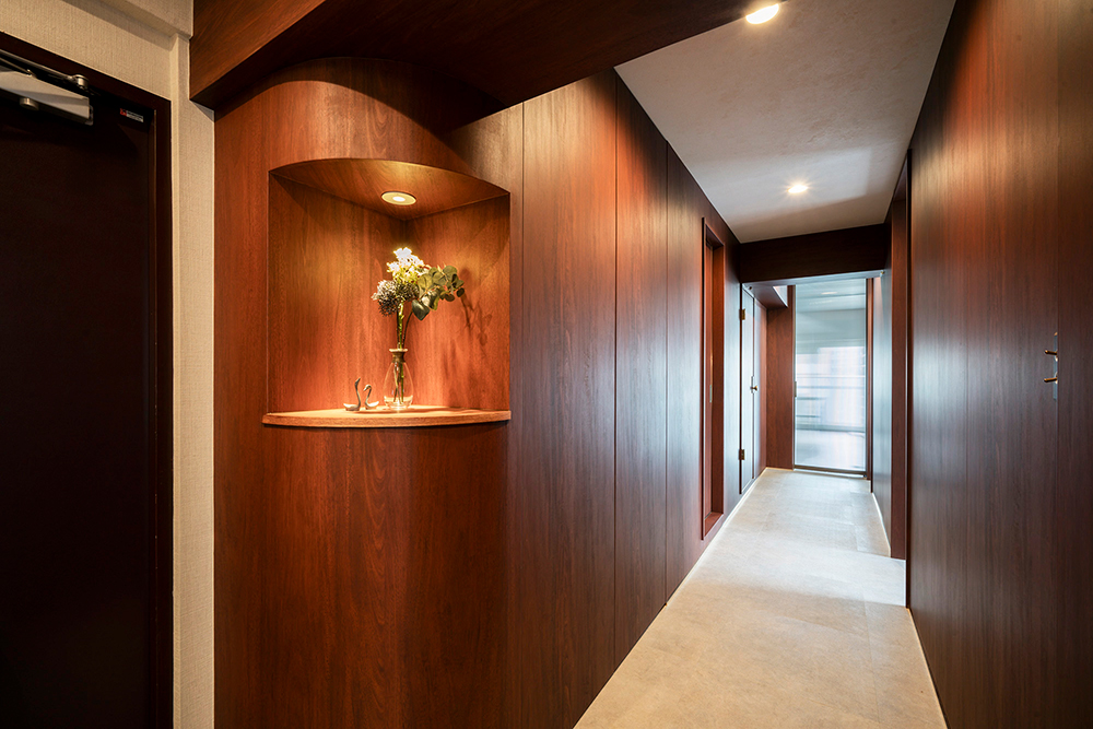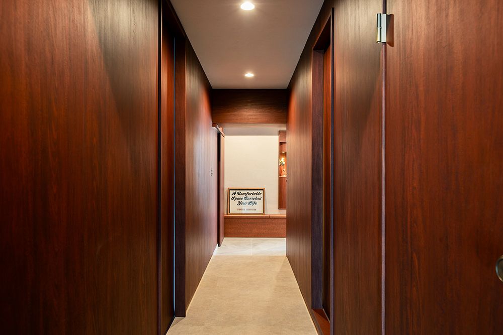 端正な木目が連なる空間は、ホテルのように落ち着きますね。コンクリートの躯体やゴールド、シルバーがセンスよく組み合わされていて魅力的なインテリアです。機能的な収納が増えたこともあり、住まい全体がすっきりまとまっています。