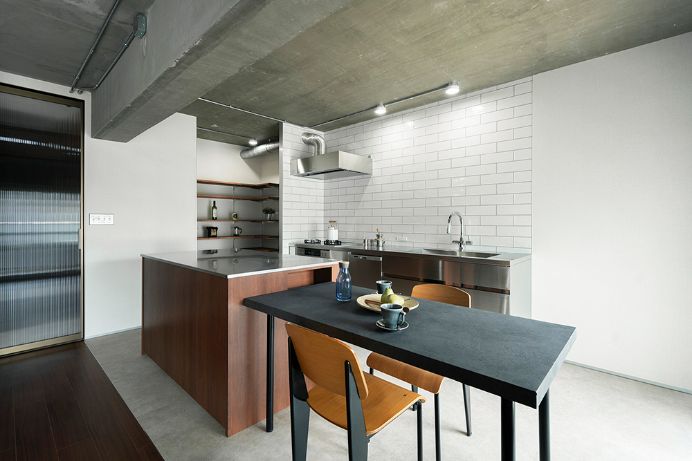 ドアを開けると広がる、木目が美しい玄関ホール。廊下の段差を解消し、壁や各部屋の扉の素材を揃えることで、凹凸の出ないフラットな空間をつくり上げています。その先のLDKは、躯体現しにした高い天井、リビングの床をそのまま立ち上げたような木の壁、素材違いの白い壁を組み合わせた、個性的でカッコいいインテリアに。キッチンのタイルは埋め込み、玄関ホール同様フラットに仕上げています。