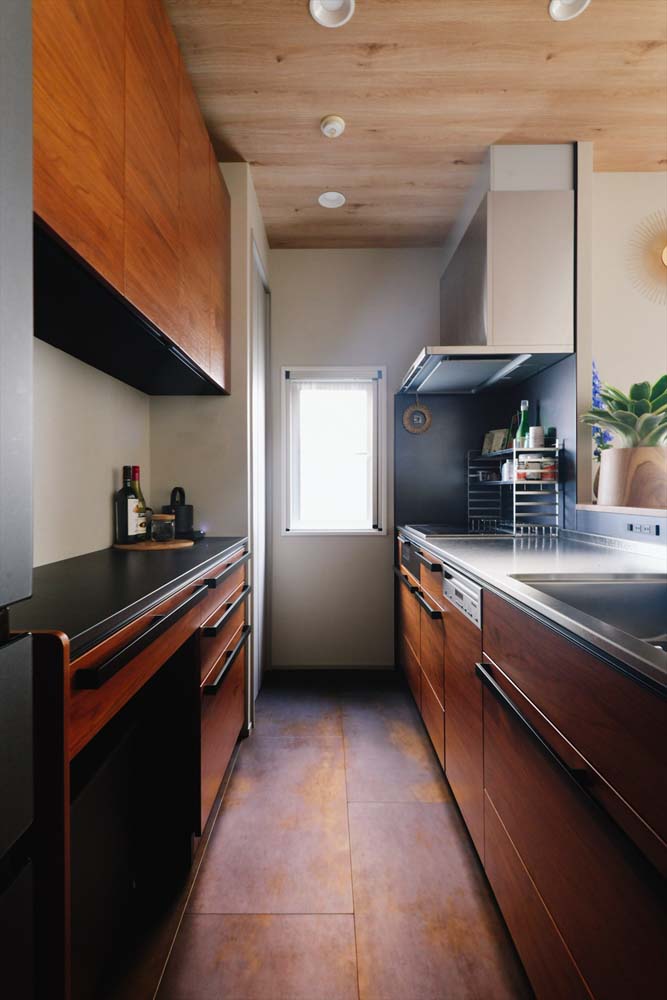 木目柄のクロス仕上げにした下がり天井と相まって、上質感ある落ち着いた雰囲気のダイニングキッチンになった。