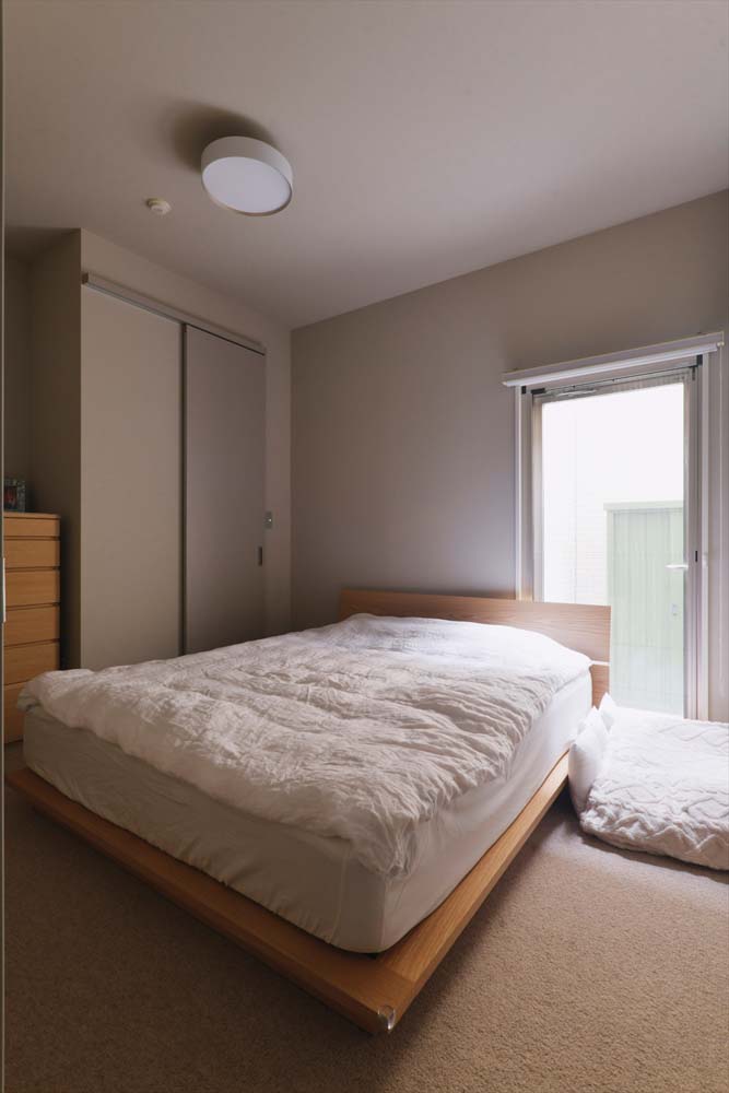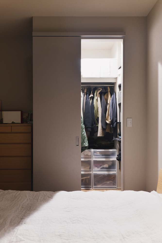 寝室は既存のクローゼットの奥行きを広げてウォークインクローゼットに変更。寝室自体は少しだけ狭くなったが、収納力がアップしてすっきりとくらせる。