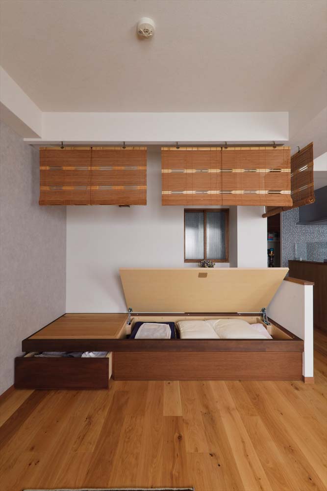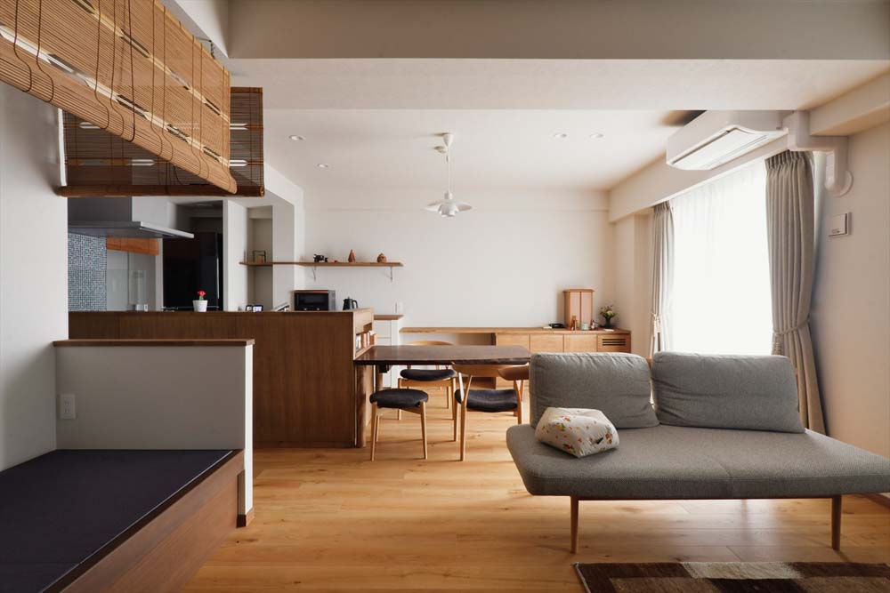 「広々としたLDK」という希望は、リビング横にあった洋室をLDKに取り込んで実現。プランナーの提案で、リビングの一角にはくつろぎの場や客間として活用できるコンパクトな小上がりを設けた。