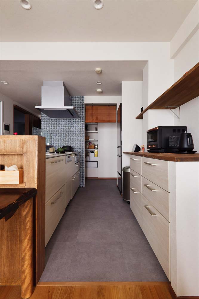 キッチンは向きを変えてぐるっと回遊できる配置に。リビングダイニング側から死角になる場所をパントリーとし、ウォークスルー型の充実した収納スペースが生まれた。