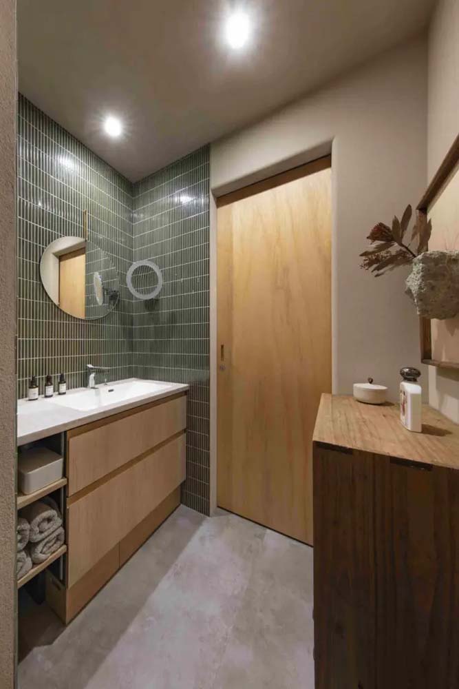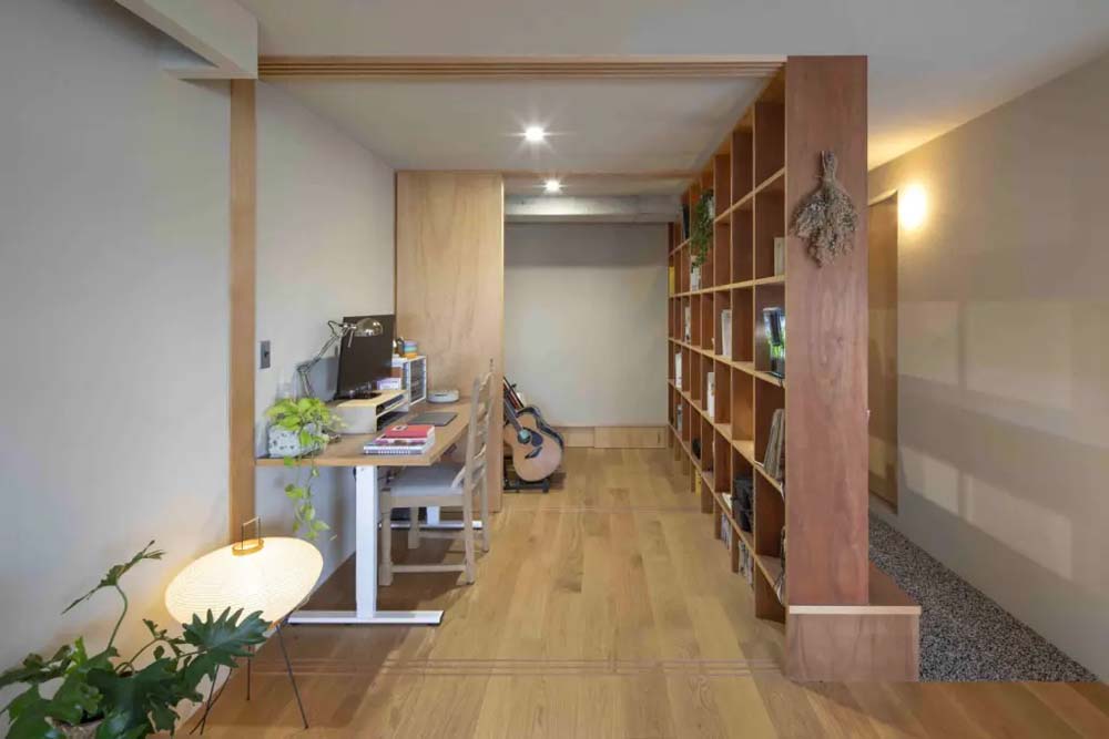 廊下は、美しく個性的な洗い出し仕上げに。壁を立てずに、廊下と部屋の両方から使える本棚と気軽に座れるベンチを造り付けています。視線が抜ける本棚は、壁と比べると仕切り自体の存在感がやわらぎ、空間に広がりも。将来のくらしや家族の変化に備えて、1LDK~3LDKまで変更できる間取りとしました。また、あえて廊下からLDKへの入り口に建具を付けないことで、リビングの採光を玄関でも得られるようにしています。