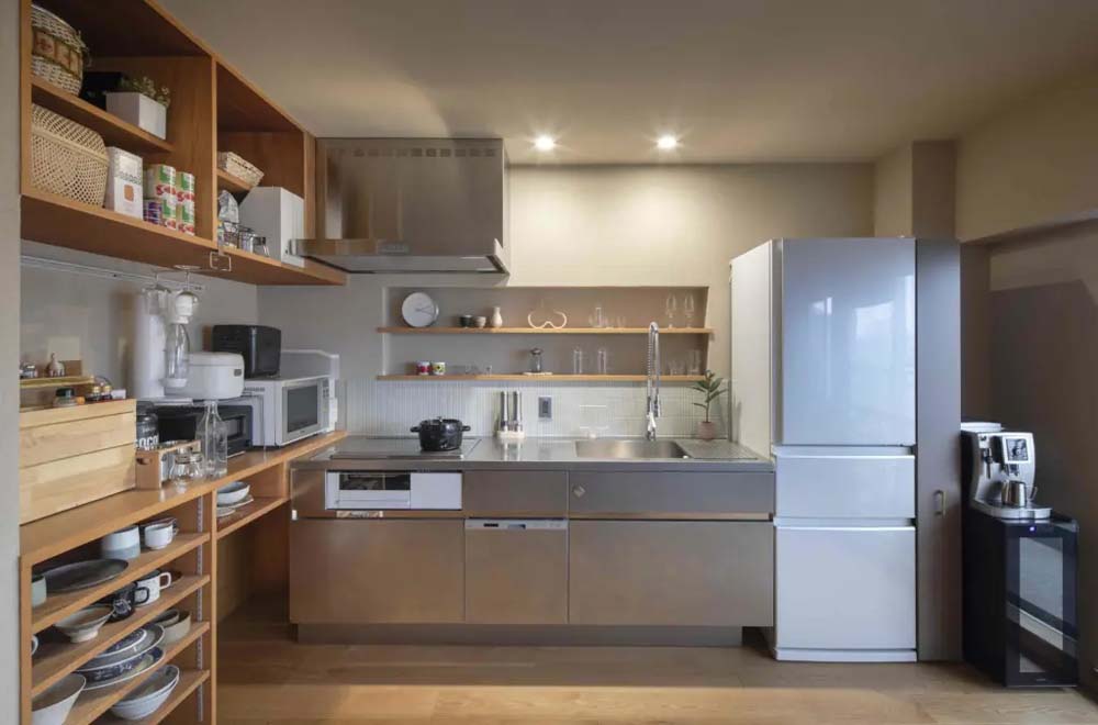 ゲストの笑顔を間近に感じながら、料理を作る時間さえも、大切な団らんの一部に。玄関からLDKまでの通り庭のような廊下には大きな本棚を設置。訪れたゲストとの会話の糸口にもなるスペースです。