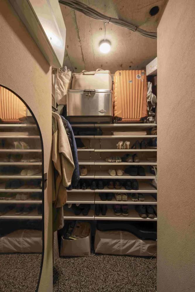 キャンプなどに使うアウトドア用品は、玄関土間に収納。寝室にオープンクローゼットをつくり、たくさんの衣類を使いやすく収納しました。寝室の畳の下にも、趣味のものや季節のものをたっぷり収納できます。
