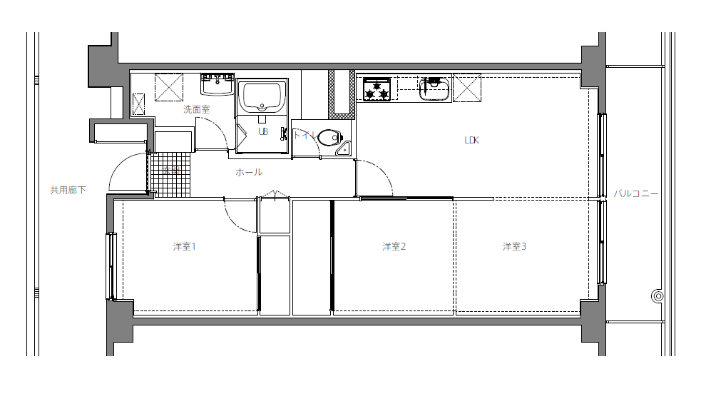 玄関からLDKまで、まっすぐな長い廊下でつながる住まい。移動のためのスペースに、別の機能をもたせながら、「通り庭」のような空間に仕立てました。
