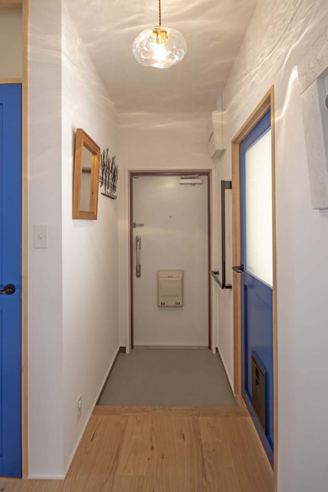 希望したのは「清涼感のあるシンプルなインテリア」と「猫が快適にくらせる工夫」。リビングダイニングは、白をベースに建具やリビングの壁に取り入れた青をアクセントにして、すっきりと爽やかなインテリアを実現。青い壁にはキャットウォーク×本棚を造り付け、建具側にもダウンライトを組み込んだキャットウォークを設けました。猫のための機能を棚や照明器具と一体化することで、空間にしっくりと馴染ませています。