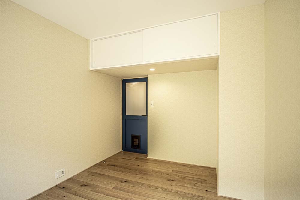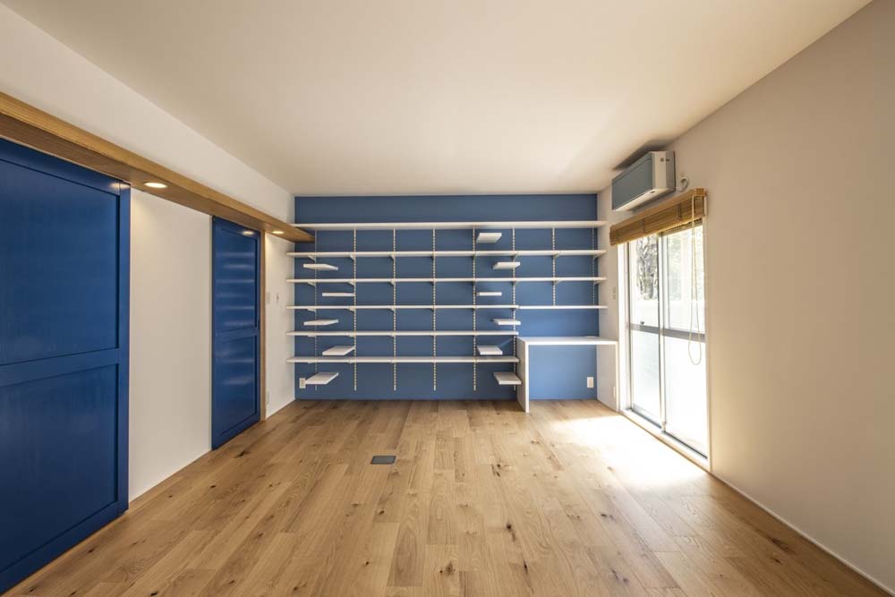 和室だった2部屋をつなげて広々リビングに。青い壁には本棚と一体になったキャットウォークを設置。建具の上に設けたキャットウォークにはダウンライトを取り付けました。
