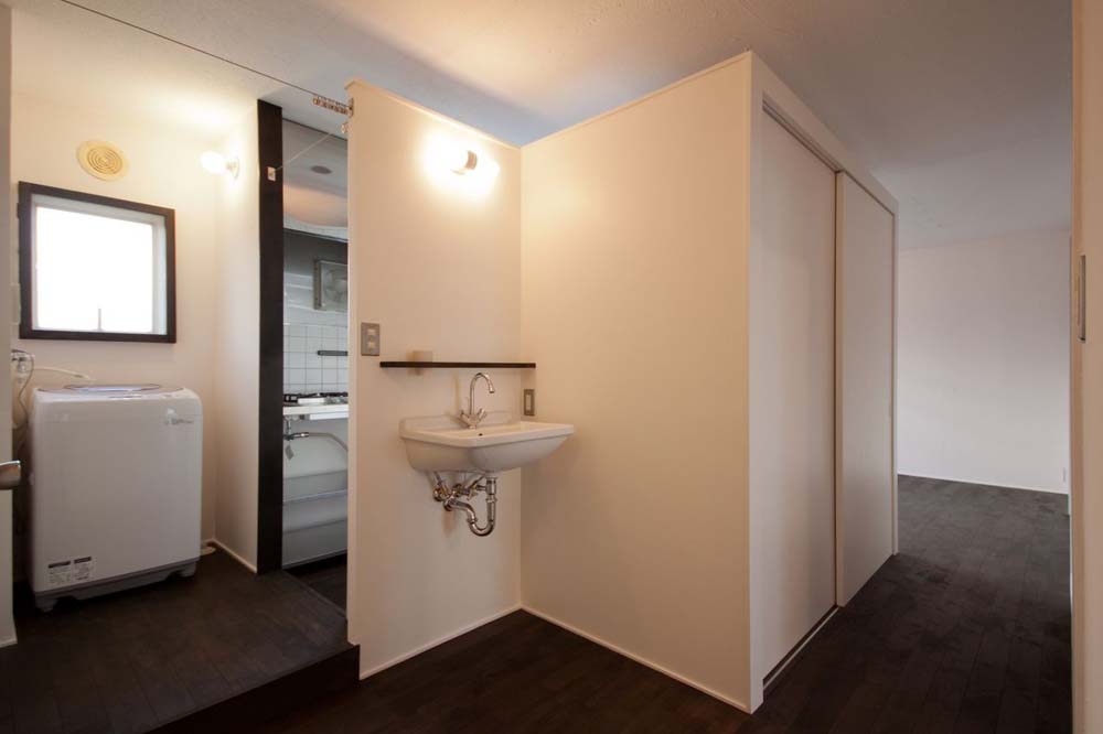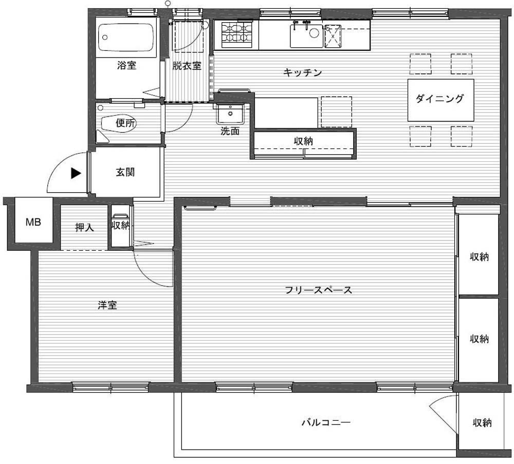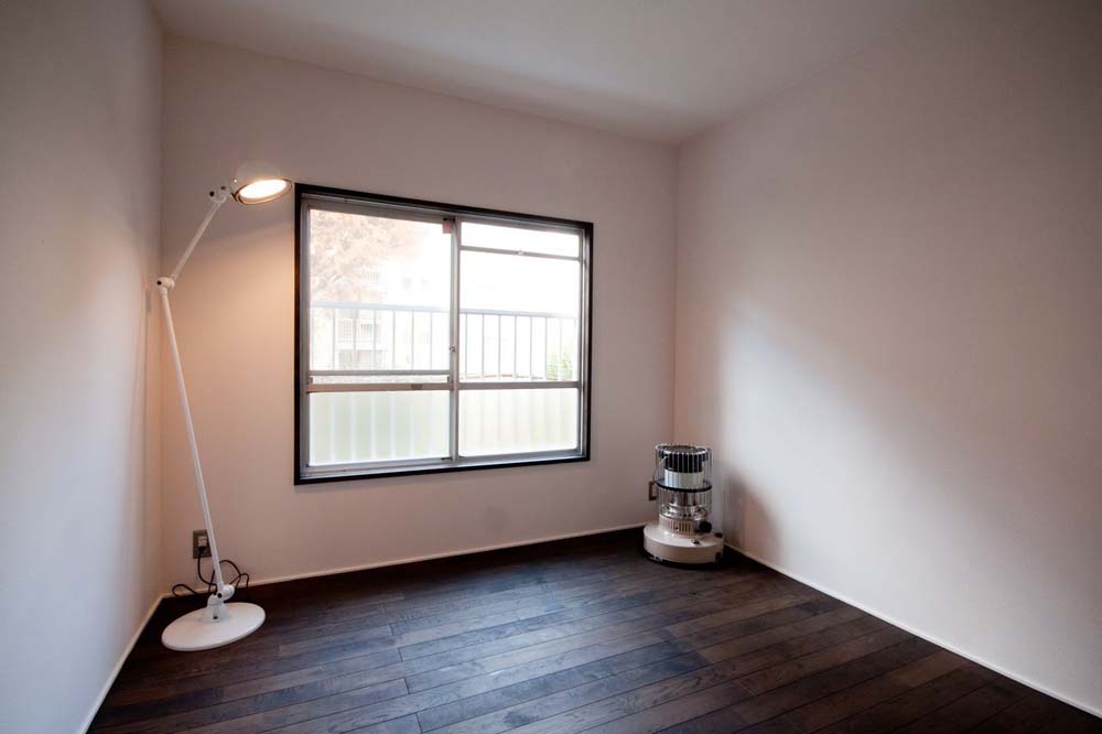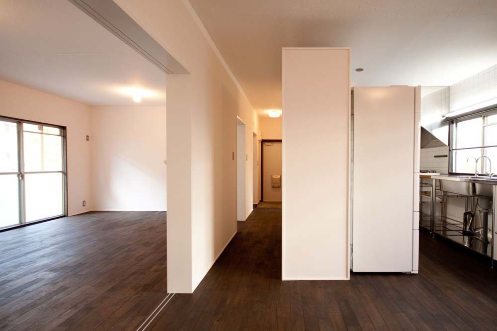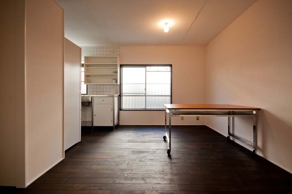 間取りは、ダイニングキッチン+12畳のフリースペース+小部屋に。できるだけ壁や扉をなくし、使い方を決めない大きなワンルームのような住まいをつくりました。床はナラ無垢材のフローリングを黒色のオスモカラーで塗装。壁や壁は白で統一することで、飽きのこないプレーンな空間になっています。