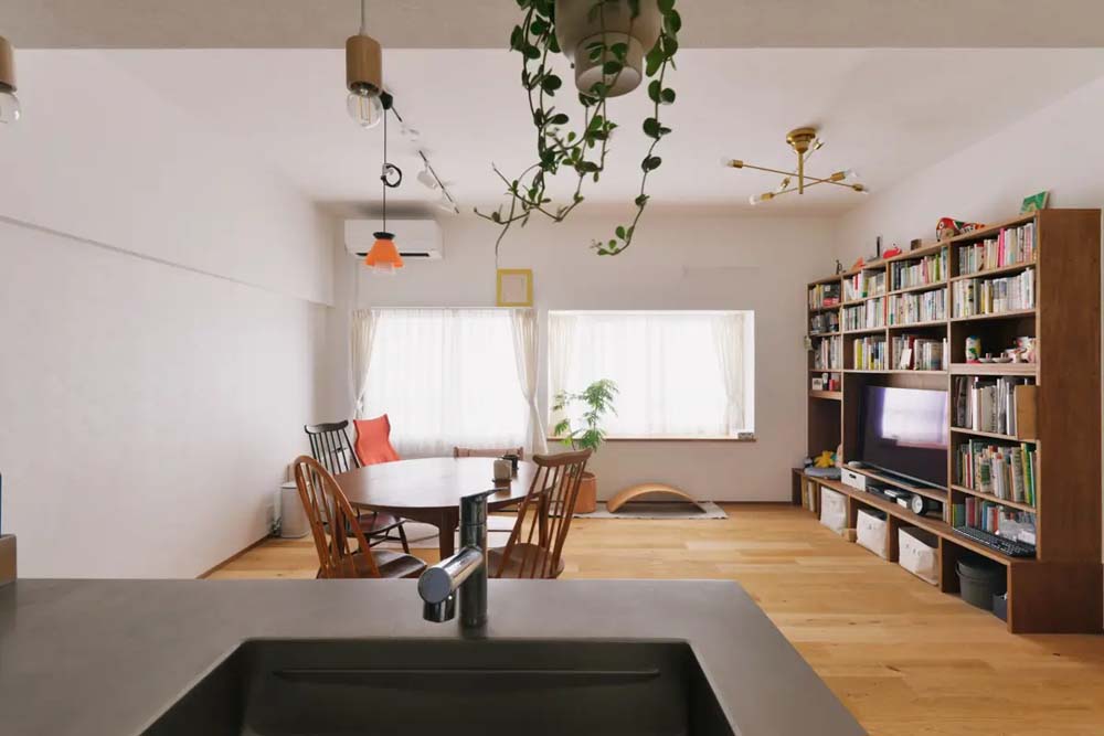 くらしの中心となるLDKは、廊下部分を取り込み、広さをグッと拡張。リビングに本棚を造作し、親子で共有するライブラリー空間をつくりました。